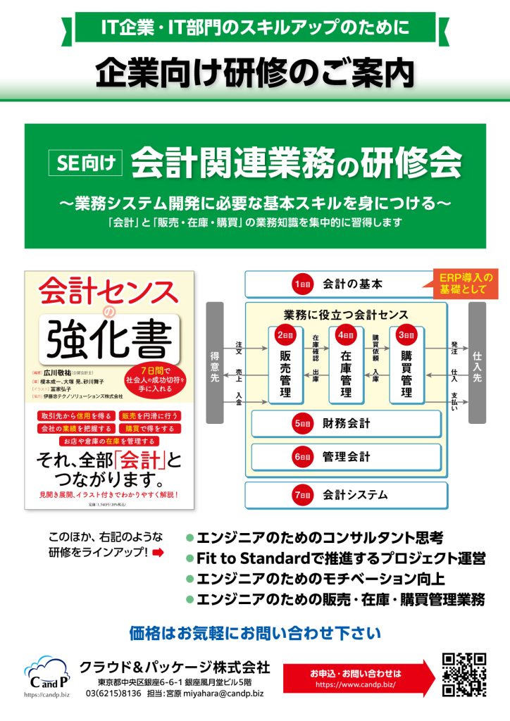 | 研修内容 | ① 会計の基本 ② 販売管理 ③ 購買管理 ④ 在庫管理 ⑤ 財務会計 ⑥ 管理会計 ⑦ 会計システム |